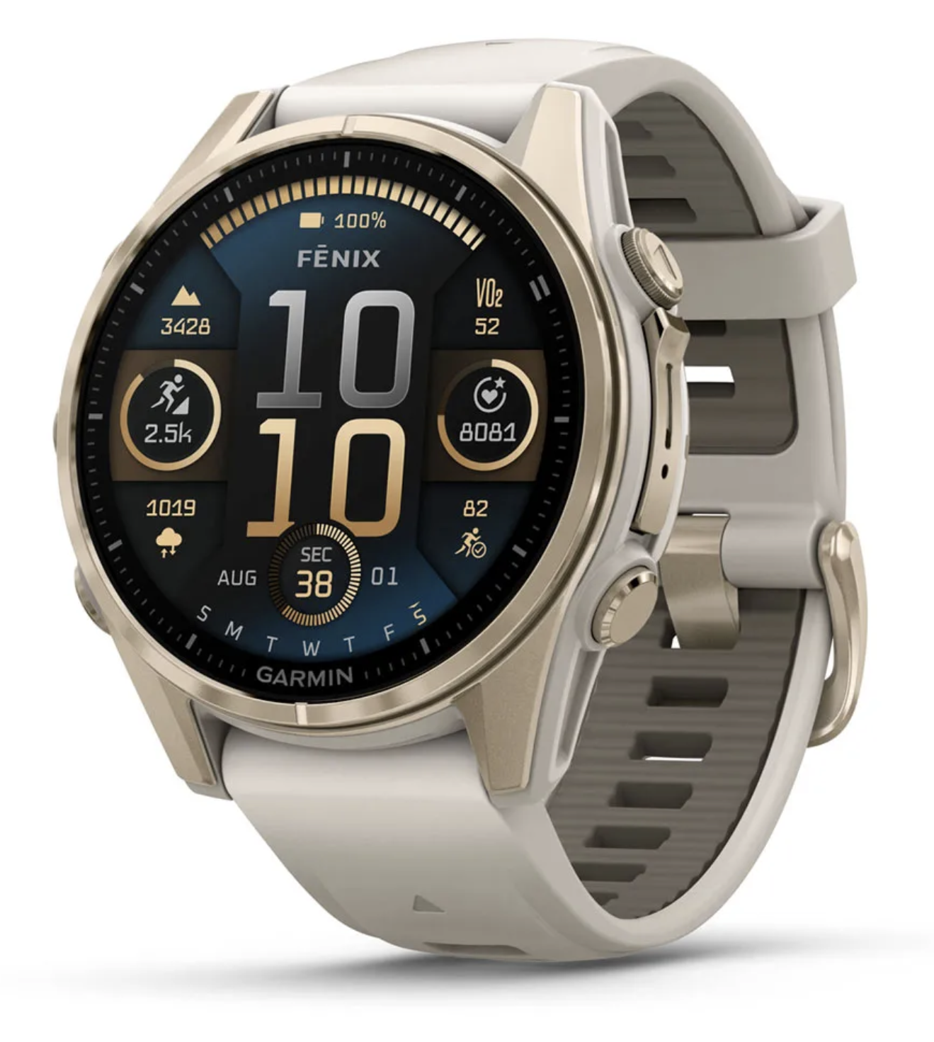Garmin Fenix 8 - 43 mm AMOLED Sapphire Soft Gold with Fog Gray/Dark Sandstone Silicone Band