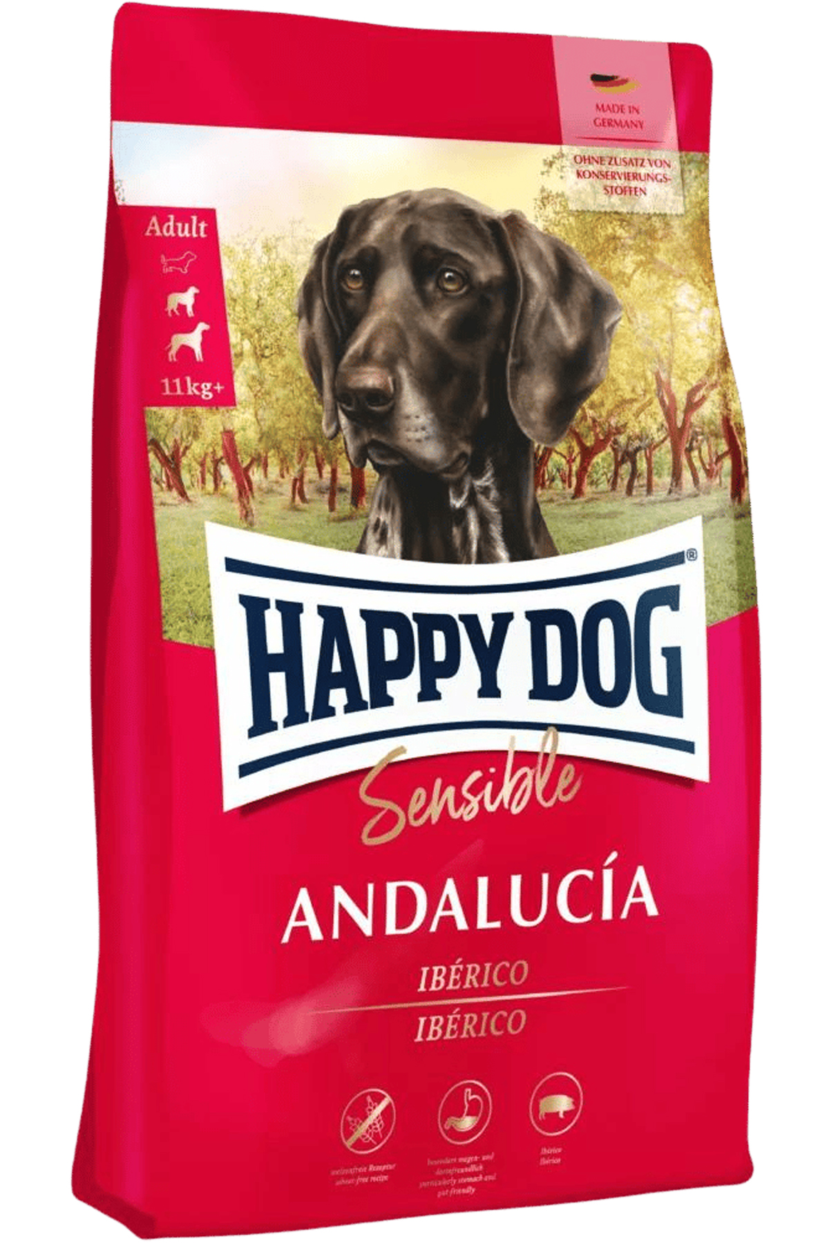 Happy Dog Sensible Andalucia koiranruoka sisältää mureaa Iberico-porsasta ja parhaita yrttejä, eikä se sisällä vehnää, eikä gluteenia. Huolella valitut, luonnolliset raaka-aineet tekevät tuotteesta todella maukkaan ja hyvin siedetyn. Todella maistuva ateria, joka on auringonkukkaöljystä saatavien omega-3- ja omega-6-rasvahappojen ansiosta erityisen vatsa- ja suolistoystävällinen.