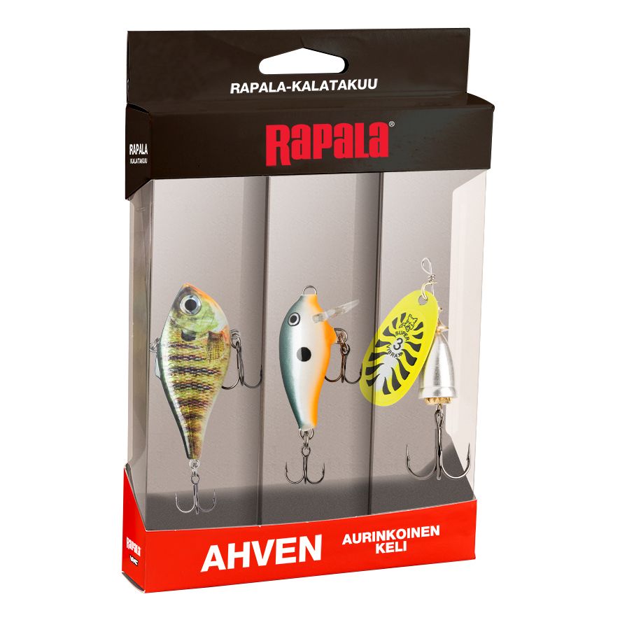 Kalatakuu Ahven aurinkoinen -viehesarja on erityisesti ahvenen kalastukseen suunniteltu viehesetti, joka sisältää valikoiman pieniä vaappuja ja lippauistimen. Vieheet on valittu suomalaisten Rapala ProGuide -ammattioppaiden ja kokeneiden kalastajien suositusten perusteella, ja ne on suunniteltu toimimaan erityisesti kirkkaalla kelillä.