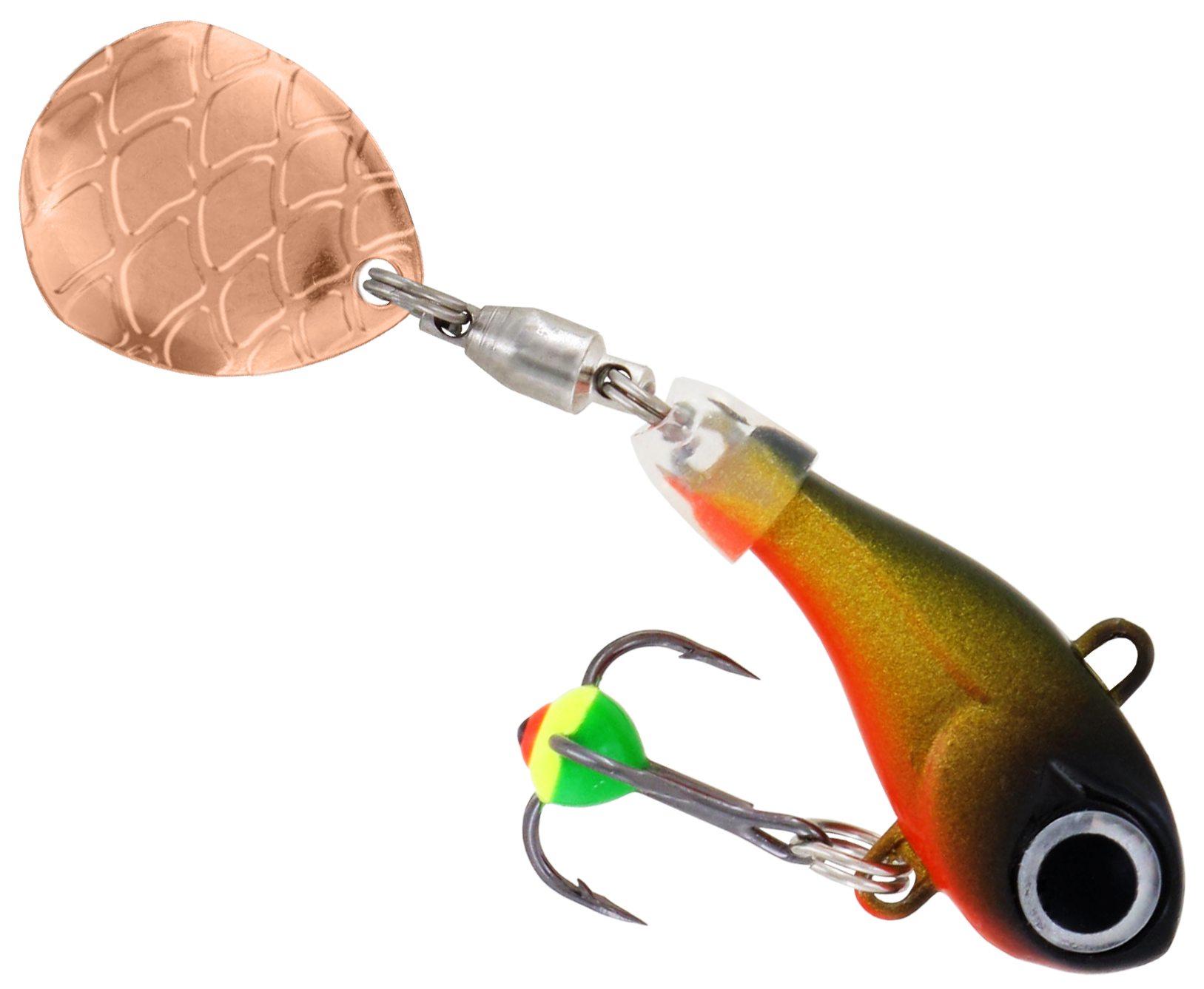 • Appelsiinikola UV: Oranssimusta kontrastiväri on osoittautunut tehokkaaksi ahvenen kalastuksessa. Kuparinen lippa viimeistelee hillityn kokonaisuuden.