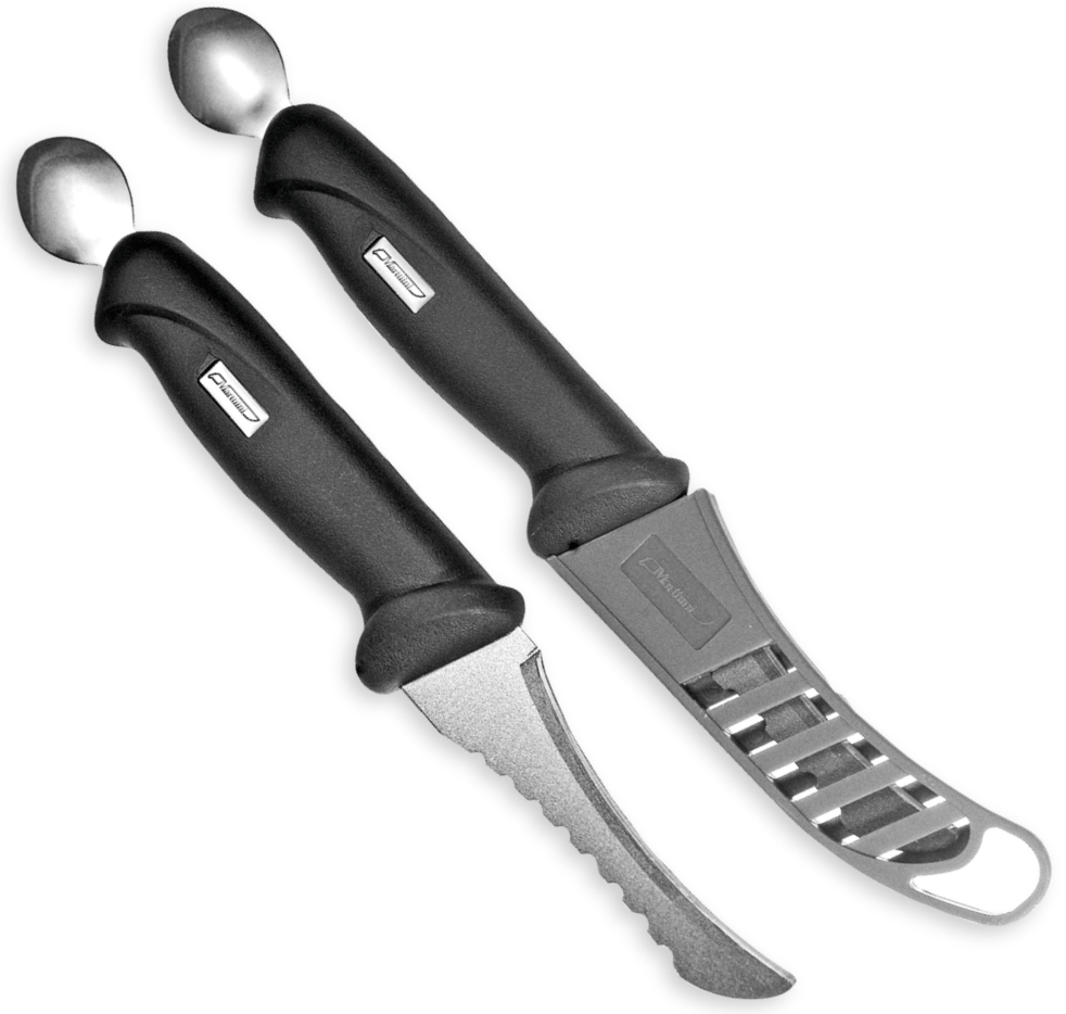 Marttiini Fish Cleaner - Kalakätevä. Kalanperkauksen moniosaaja. Kalakätevä on nimensä mukaisesti näppärä työkalu kalojen perkaamiseen. Kaarevalla terällä kalan avaaminen on helppoa ja hammastuksella suomustaminen käy kätevästi. Kahvan päässä olevalla metallilusikalla sisälmysten poistaminen on siistiä ja nopeaa. Terää suojaa muovinen teränsuojus.