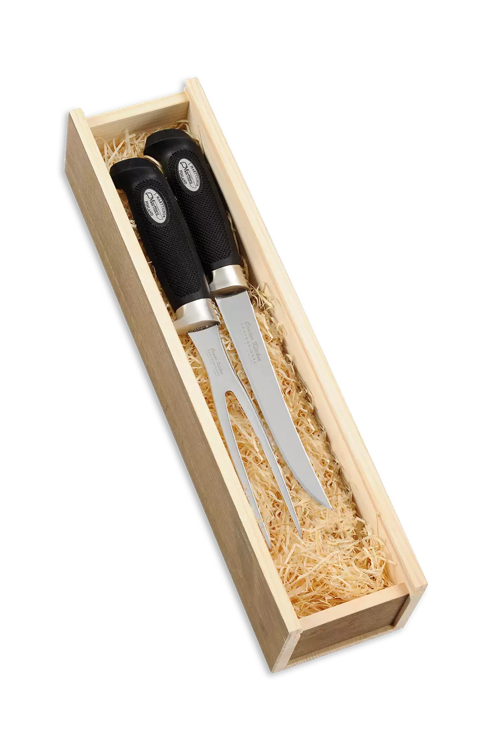 on näyttävä ja käytännöllinen setti kinkun leikkaamiseen. Sopiihan se toki myös muillekin ruuille. Tämän kinkkusetin lihaveitsi ja -haarukka muodostavat täydellisen parin juhlapöytään. Setti toimitetaan tyylikkäässä puisessa lahjalaatikossa.