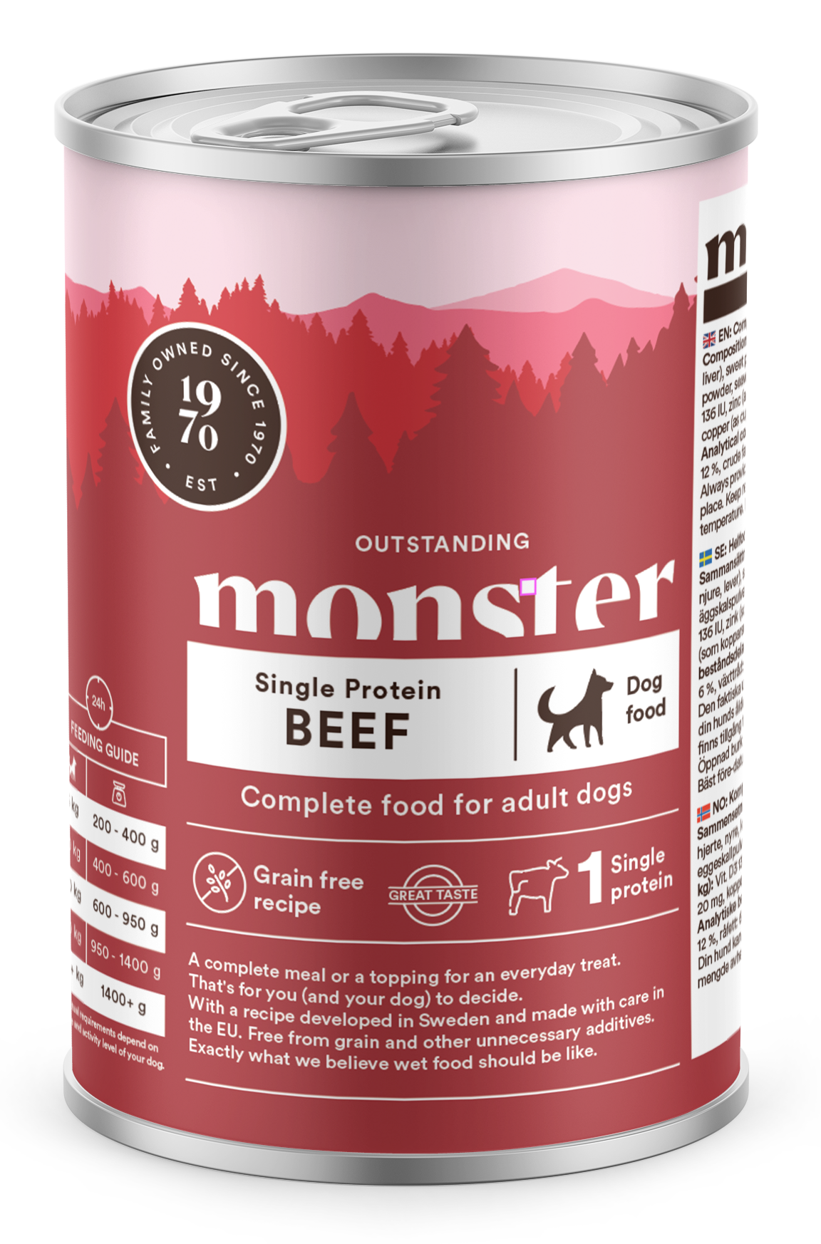 Monster Dog Adult Single Beef 400g on 100% viljaton, korkeaproteiininen ja lihapitoinen säilykeruoka, joka sisältää herkullista naudanlihaa. Voidaan käyttää joko täysravintona tai pienenä arjen luksuksena. Tuote on kehitetty Ruotsissa ja valmistettu tarkkaan valituista raaka-aineista – ilman tarpeettomia lisäaineita.