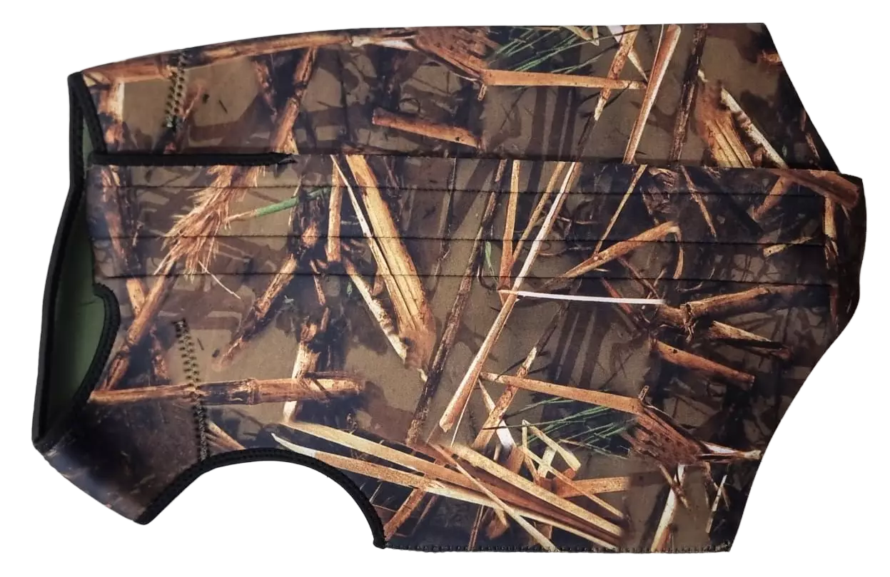Nordhunt Dog Vest Camo on koiran turvaliivi, joka on suunniteltu suojaamaan koiraa kylmältä sekä maalla että vedessä. Liivi on valmistettu joustavasta 4 mm paksuisesta neopreenista, mikä tekee siitä mukavan ja lämpimän. Ulkopuolella on camo-kuviointi, joka antaa liiville tyylikkään ulkonäön. Liivi suljetaan selkäpuolelta vahvalla vetoketjulla ja tarranauhalla, mikä varmistaa, että se pysyy hyvin paikoillaan. Kaikissa etureunoissa on kanttinauhat, jotka lisäävät mukavuutta ja estävät hiertymiä.