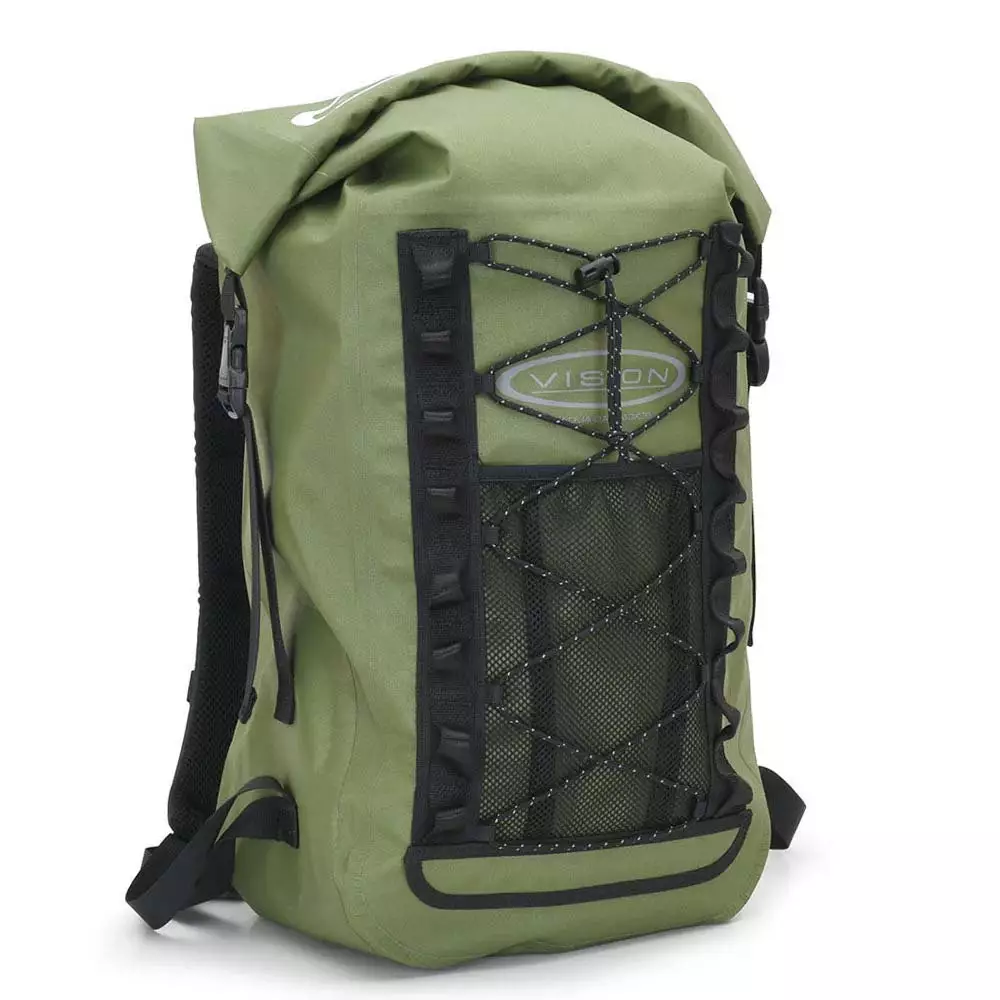 Vision Aqua Day Pack 35L Olive – vesitiivis reppu, joka on suunniteltu pitämään varusteesi kuivina kalastusretkillä tai muissa ulkoilma-aktiviteeteissa. Repun tilavuus on 35 litraa, ja se on valmistettu kestävästä PU-pinnoitetusta nailonista.